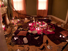 AA Bronson & Peter Hobbs AA Bronson and Peter Hobbs' Invocation of the Queer Spirits (Governors Island), a séance held here on June 25, 2009, invoked historical, queer, and marginalized practices as a way to heal the past and acknowledge the present. As Bronson described, the ritual includes "drawing a circle, asking for protection, and invoking the spirits, naming the various histories and communities of the dead." This intervention underscores how queer communities have overlapped with the histories of Spiritualists and shamans, as well as all-male communities such as the military population that called Governors Island home. Inspired by the countless lives and deaths that took place on the island, the project invites us to think again about what is valued and what is excised from our collective history. The physical remains of the ritual are presented here. |