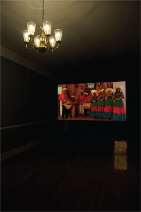 Judi Werthein To create La Tierra de los Libres, Judi Werthein chose to collaborate with itinerant agricultural workers from Colombia's Pacific Coast who were driven to inland cities by conflict surrounding the drug trade. To make a living in their new, urban environment, this group drew on a cultural tradition of singing while they worked and began performing in local restaurants and bars. Werthein gave the musicians a literal Spanish translation of The Star-Spangled Banner and asked them to play the song in their own style. She then filmed them performing their version and translated the fragmented and recursive lyrics back into English for the subtitles in the video. This artwork continues her exploration of the notion of "cultural integrity" and mistranslation. |