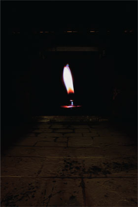 Krzysztof Wodiczko In Krzysztof Wodiczko's Veterans' Flame, the image of a candle flame moves with the recorded voices of veterans sharing accounts of war and its aftermath in Iraq and Afghanistan. Wodiczko conducted the interviews in April 2009, interested in having his subjects explore, through the act of remembering and retelling, the complex psychological space between the battlefield and their homes. By appropriating public buildings and monuments as surfaces for projections in his work, Wodiczko has focused on the ways in which architecture reflects collective memory, history, and the loss of life. Here, Fort Jay's silent chambers are once again filled with the voices of soldiers, and a monument to history's conflicts becomes a place to contemplate contemporary accounts of war and longing. |