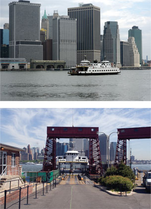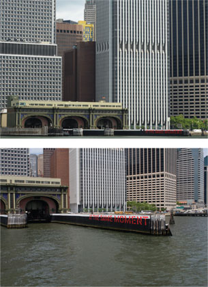 Lawrence Weiner As this ferry departs Manhattan, passengers can see the work of artist Lawrence Weiner: the words AT THE SAME MOMENT painted on the wooden fender rack that guides the ferry into and out of its slip. Weiner is an artist whose medium is language, and his work for This World & Nearer Ones reflects his ongoing examination of the relationship between language and physical site. Text-from the official signs in subways and on streets to the ubiquitous presence of advertising-guides our experience in the world. AT THE SAME MOMENT invites us to consider the spatial and temporal relations between two distinct places and the ferry journey that links them together. The ferry's shuttling back and forth echoes the many populations that have come and gone from the island, from the Native Americans to the Dutch and British, the US Army and Coast Guard, and the thousands of civilians who enjoy it today. As one group departs, another arrives at the same moment. As a greeting and a farewell to visitors, Weiner's text kindles a sense of this history and fleeting simultaneity in the mind of the receiver. |
