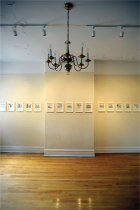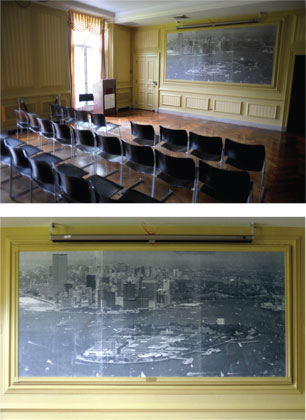 Tercerunquinto A few weeks before This World & Nearer Ones opened, the Mexican collective Tercerunquinto threw a rock through a window of the second floor of Liggett Hall (the large building that faces this house). On its surface, this action conveys a sense of reckless, juvenile destruction, but on a deeper level it was a calculated experiment in institutional negotiation. The buildings on the northern half of the island are protected under historic preservation guidelines-like architectural time capsules-unlike those on the southern half. The shattering of the window can be seen as a fleeting rupture in the hermetically sealed historicity of the northern section of the island-a break with the past. The window was replaced, speaking to the way that inconvenient truths may get paved over by history. |