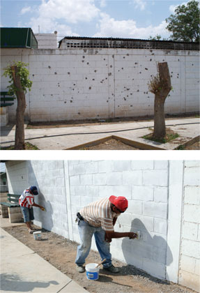 Teresa Margolles Teresa Margolles' Muro Baleado is a cinder-block façade relocated from the artist's home city of Culiacán, Mexico. It is pockmarked with bullet holes and bears specks of what seem to be dried blood: the results of a deadly shooting linked to organized crime. Culiacán, known as "Narco City," has an active underground economy based on the trafficking of illicit drugs-and on its streets, shootings are commonplace. In a performance over the course of this exhibition's opening weekend, a Mexican masonry crew reassembled the wall here in Nolan Park. Margolles' work invents new ways to remember, mourn, and reflect on the dead through their physical impressions on the world. It is impossible to ignore, as well, the link between the shooting that occurred in front of this wall and international counterdrug policy. This artwork's scarred surface reflects the histories of violence in two countries and the wall that runs between them. |